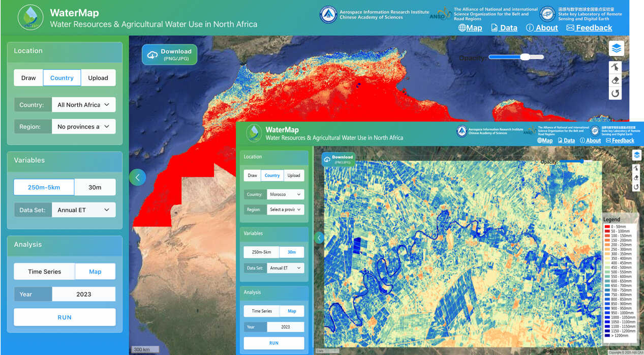 Developed by the AIRCAS research team led by Prof. JIA Li, the WaterMap N-Africa platform is a core outcome of the ANSO project “Monitoring and Assessment of Water Resources and Agricultural Water Use in North Africa”. Built on web technologies, big Earth data management, and cloud analytics, the platform provides users with 30-meter ET, GPP, NPP, WUE, P-ET, and other agricultural water-resource monitoring products, along with tools for extracting and analyzing spatial–temporal datasets. As a localized system supported by multiple North African institutions, WaterMap N-Africa marks a significant step forward in China–Africa cooperation in Earth observation and agricultural water management. Its promotion and application will offer essential technical support for tackling regional water challenges, improving food security, and addressing climate change—standing as another successful example of international cooperation under the Belt and Road Initiative.