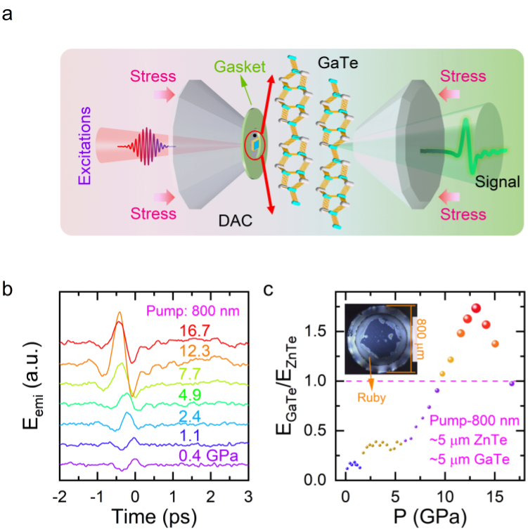A collaborative team from the Aerospace Information Research Institute of the Chinese Academy of Sciences (AIRCAS), the Hefei Institutes of Physical Science of CAS, and the Center for High Pressure Science & Technology Advanced Research used high pressure as a clean and powerful tuning method to manipulate GaTe's crystal and electronic structure. Their experiments not only amplified the THz wave output but also revealed a key time-domain signature: a phase shift of more than 150 femtoseconds showed that the transient current process occurs before optical rectification. This ordering became directly visible only under high pressure.