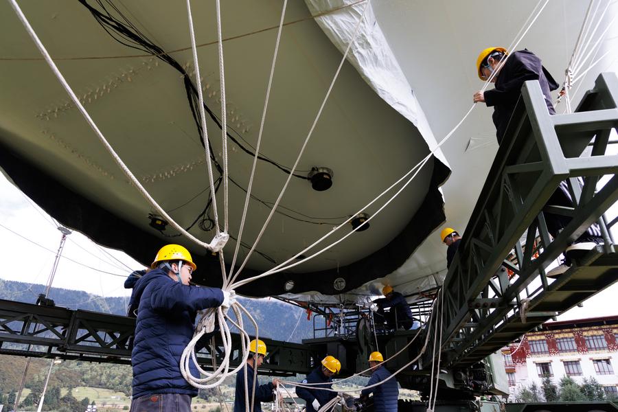 Technicians adjust the observation payloads during the "Jimu-1" tethered balloon atmospheric observation experiment in Lulang, Nyingchi, southwest China's Xizang Autonomous Region, Sept. 18, 2025. (Xinhua/Jin Liwang)
