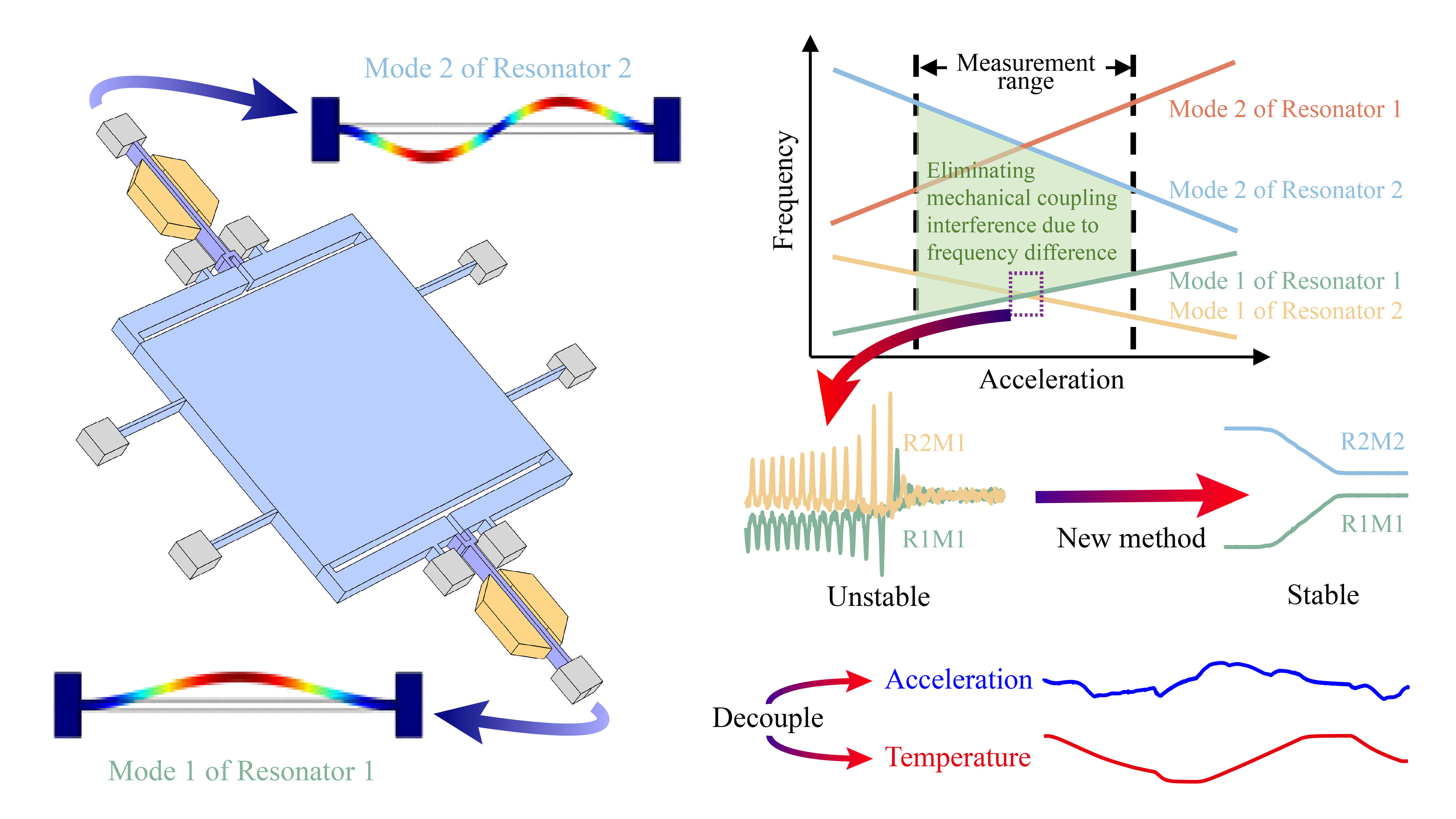 Operating principles and system performance of the differential resonator, featuring modal separation to avoid energy coupling and enable temperature-compensated acceleration sensing. (Image by AIRCAS)