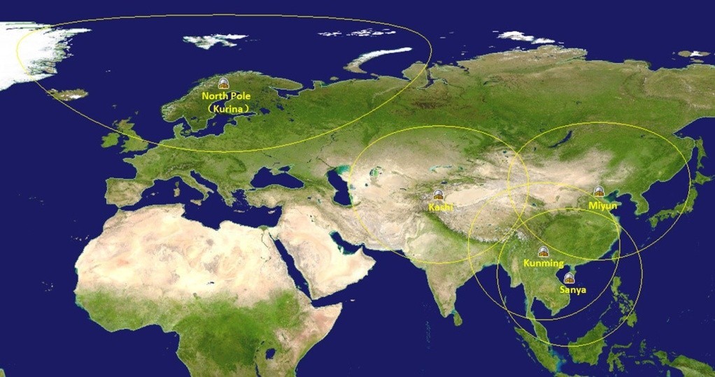 Fig.1 Reception mask of Miyun, Kashi, Sanya, Kunming and North Polar ground stations of RSGS