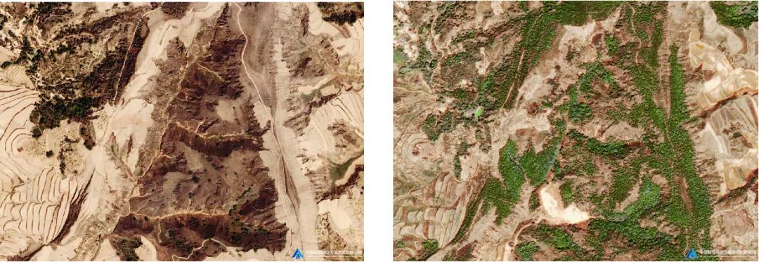 Afforestation campaign on the Loess Plateau of northern Shaanxi. Dates: July, 2005 (SPOT-5) – August, 2017 (GF-2)