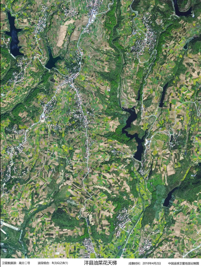 Image captured by GF-2 on April 2, 2018 shows rapeseed flower fields in Yangxian County, northwest China's Shaanxi Province. (Image by AIR)