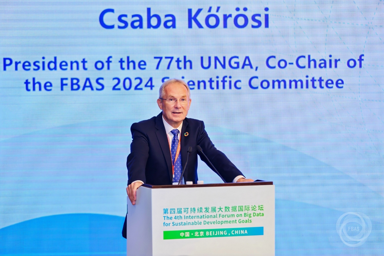 Csaba Kőrösi, a CBAS Fellow, Co-chair of FBAS 2024 Scientific Committee, the President of the 77th United Nations General Assembly, reading the Beijing Declaration on Partnership for Accelerating Sustainable Development through Digital Technology' at the closing ceremony. (Image by AIR)
