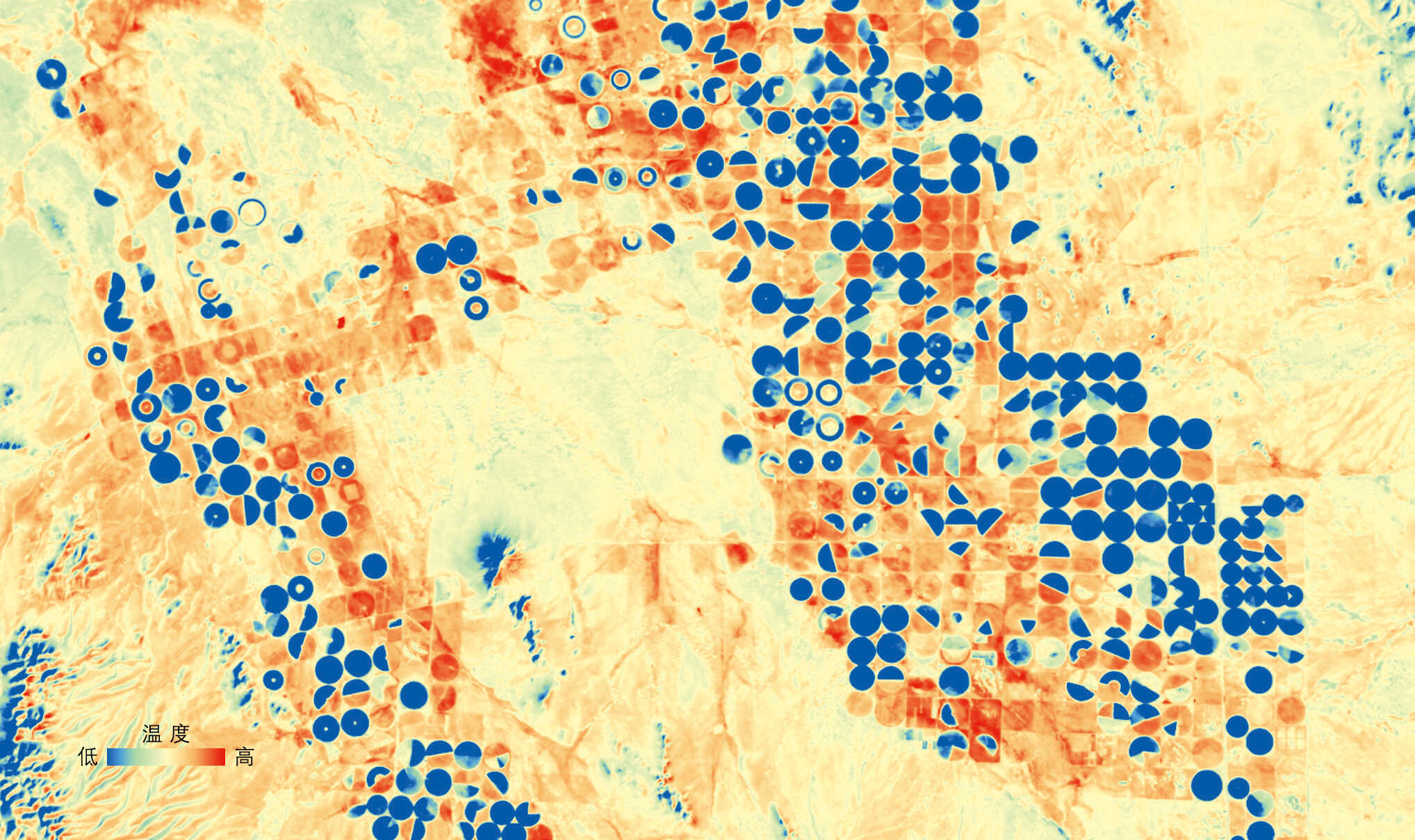 Chihuahua is an inland state in northern Mexico and a significant agricultural production area in the country. The environment within Chihuahua is highly diverse. In the daytime thermal infrared image, the circular irrigated agricultural areas have a lower temperature compared to the surrounding environment.