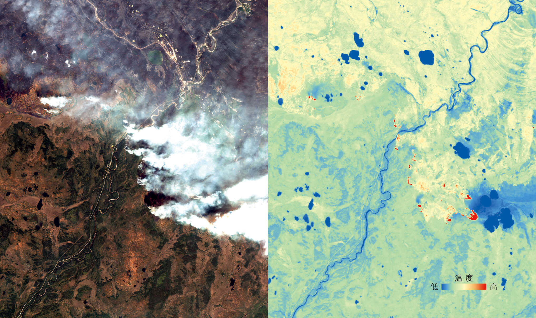 Wildfire - Northwest Territories, Canada. (Left Image: True-Color Multispectral Image; Imaging Date: 2023-08-21 Daytime; Right Image: Single-Band Thermal Infrared Image; Imaging Date: 2023-08-21 Daytime; Image by AIR)