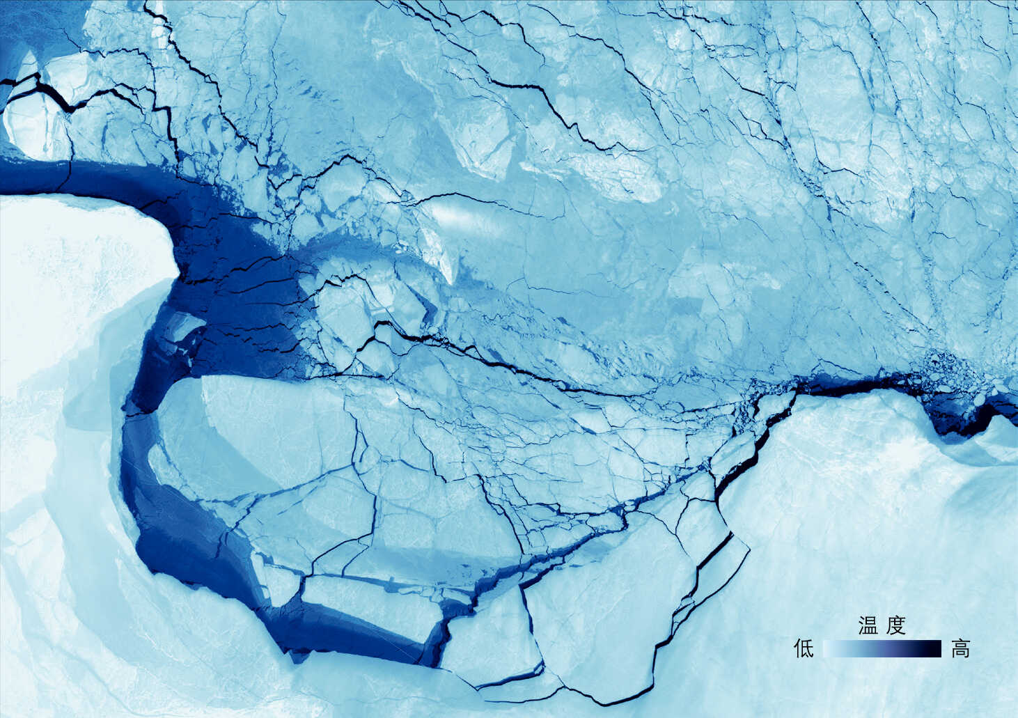 This image, acquired on March 28, 2023, shows single-band (10.3–11.3 μm) thermal infrared pseudo-color data from SDGSAT-1 off the eastern coast of the Severnaya Zemlya Archipelago in the Arctic Kara Sea. The color gradient from light blue to dark blue represents temperature variations between sea ice and seawater. The large, dark blue banded areas indicate coastal polynyas, where higher-temperature seawater and thin ice are exposed, creating a stark temperature contrast with the thicker floating ice. At a 30-meter resolution, fine cracks in the sea ice (ice leads) are also clearly visible, showcasing rich details.