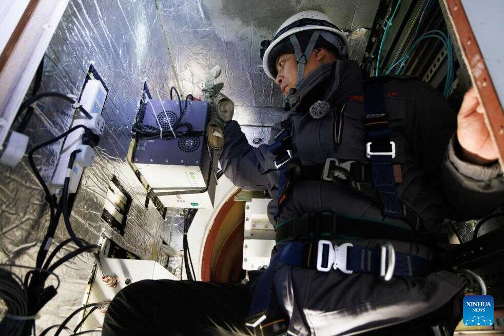 Shi Shengpu, director of the Mohe Station of the China Remote Sensing Satellite Ground Station, performs maintenance tasks inside the central structure of the antenna at the station in Mohe, northeast China's Heilongjiang Province, on Jan. 25, 2026. (Xinhua/Jin Liwang)