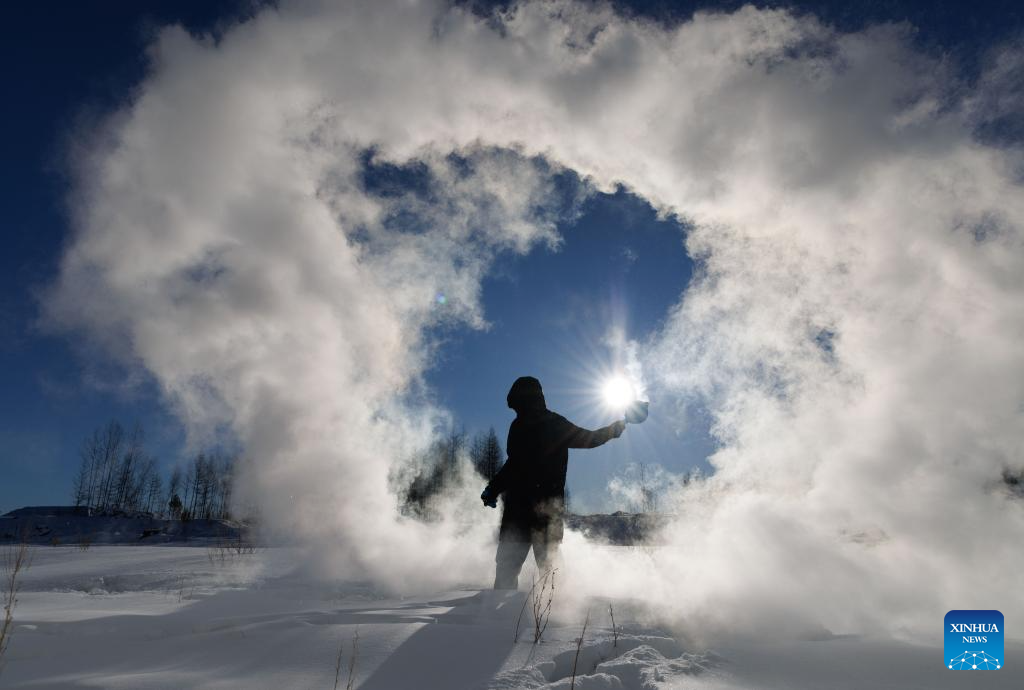 Assistant Engineer Tian Dong plays a game in which splashed water turns into ice in extremely cold air at the Mohe Station of the China Remote Sensing Satellite Ground Station in Mohe, northeast China's Heilongjiang Province, on Jan. 25, 2026. (Xinhua/Jin Liwang)
