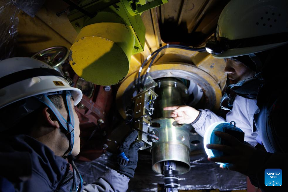 Engineer Li Qiang (R) and Assistant Engineer Tian Dong perform maintenance tasks at the azimuth cabin of the satellite data receiving system at the Mohe Station of the China Remote Sensing Satellite Ground Station in Mohe, northeast China's Heilongjiang Province, on Jan. 24, 2026. (Xinhua/Jin Liwang)