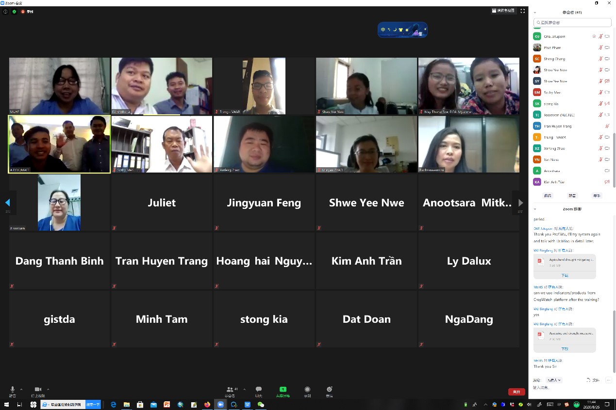 A training workshop on “geospatial information applications for agricultural monitoring in Lower Mekong Basin countries” was held online from August 5 to 26, 2020, with the attendance of 47 people from the government agencies or research institutions of Cambodia, Myanmar, Thailand, and Vietnam, hoping to learn essentials and technologies such as Earth observations for crop monitoring, agro-climatic and agronomic indicators preprocessing, thematic mapping, and field data collection.