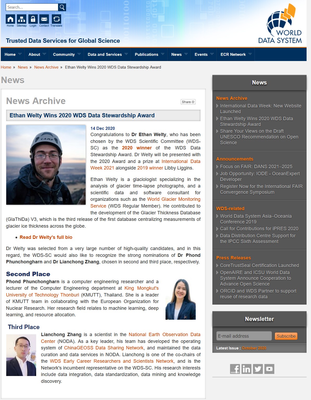 The notice of the 2020 WDS Data Stewardship Award and a brief introduction of the winners.