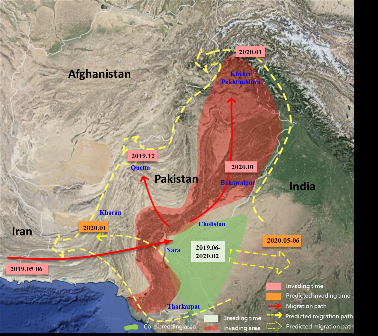 Fig.1 shows the migration path of the Desert Locust from Year 2018 to 2020. Due to the influence of Northeast Monsoon and the barrier of Qinghai-Tibetan Plateau, it has a lower probability of the Desert Locust in the Indo-Pakistan border invading China at present, according to the analysis. However, if the locust in Pakistan and India cannot be controlled effectively, and even disasters erupt, then when the Southwest Monsoon is extremely strong, it may have a higher probability for the locust moving from India to Myanmar via Bangladesh, and higher risk to invade China's Yunnan and Tibet from May to June 2020, according to the analysis.