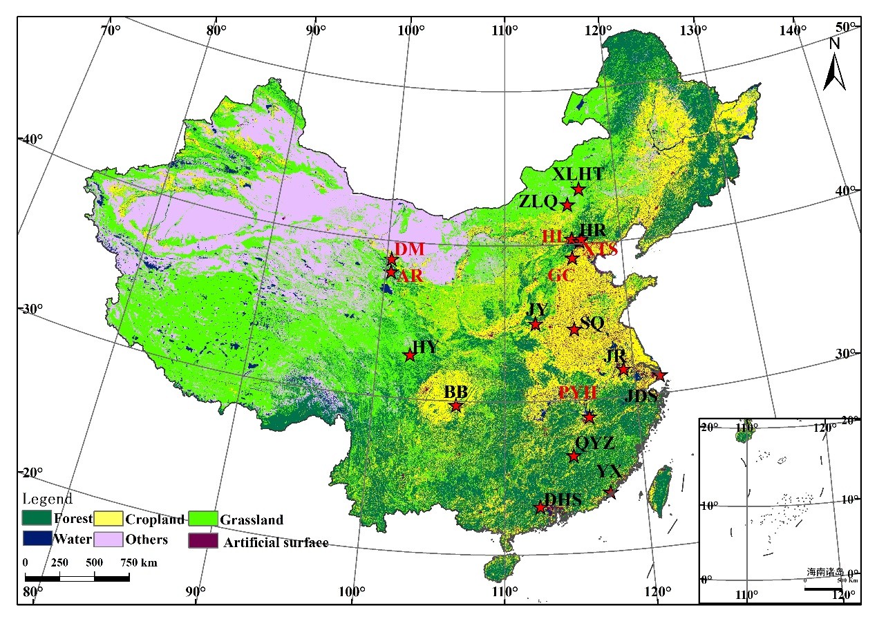 Diagram map of ChinaSpec sites, among which the red labels represent sites constructed by AIR.