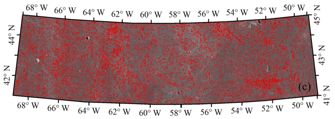 The craters within the CE-5 landing area were visually identified and manually digitized from the above mosaic with an ArcGIS extension named “CraterTools”. When manually digitizing the craters, the DOM mosaic is visualized in a local tangent plane projection to make it convenient and precise for crater mapping. Three points along the crater rim are identified to fit a circle representing the crater, which is further refined with the help of SLDEM2015 data. Finally, an elliptical outline representing the crater rim is fitted, and a number of parameters, such as the diameter and the ratio of depth to diameter, are derived. As a result, 174297 craters are mapped in this area, among which 140796 craters are larger than 100 m and 32277 craters are larger than 200 m in diameter.