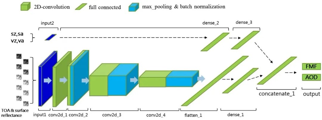 Fig. 1.The multi-input neural network architecture of MODIS FMF and AOD prediction.
