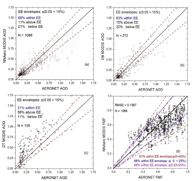 The NNAero results over northern and eastern China were validated against an independent reference AERONET dataset. The results show that 68% of the NNAero AOD values are within the MODIS expected error envelope (EE) over land of ±(0.05 + 15%), which is similar to the results from the MODIS Deep Blue (DB) algorithm (63% within EE), and both are better than the Dark Target (DT) algorithm (31% within EE).
