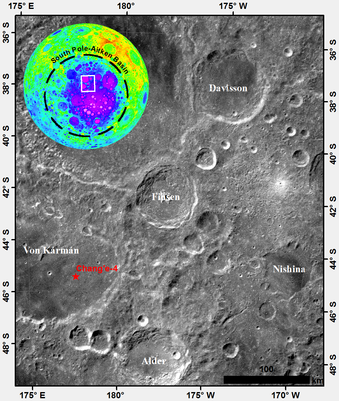 China's Chang'e-4 probe, including a lander and a rover, successfully touched down the floor of Von Kármán crater within the South Pole-Aitken (SPA) basin on the farside of the Moon on January 3, 2019 (Fig. 1). Since then, Chang'e-4 rover has been traversing on the floor of Von Kármán crater and has carried out a string of in situ measurements along traverse with equipped scientific payloads, enabling scientists to study unexplored lunar areas in great detail.