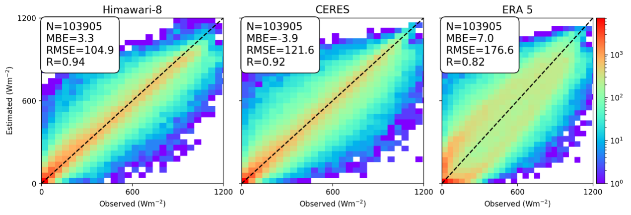 Figure 2. Comparison of the hourly SWDR results of H-8, CERES and ERA5 to ground-based measurements in 2016. MBE and RMSE are expressed in Wm-2. The number of ground sites is 27. (Image by AIR)