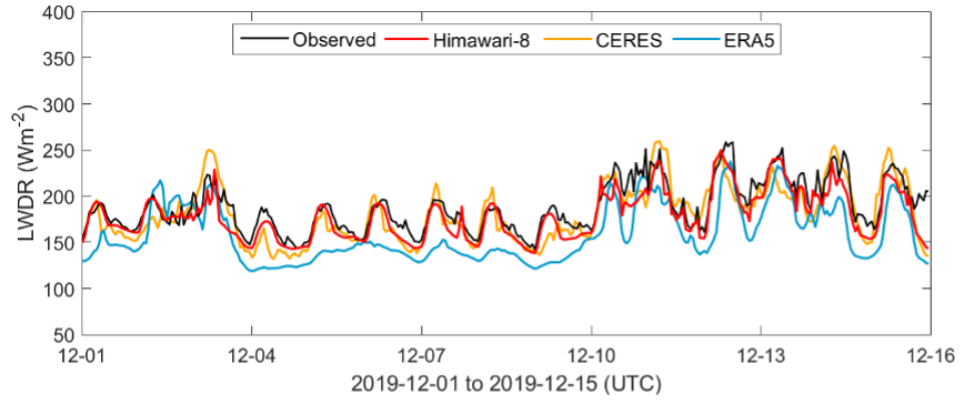 Figure 3. Comparison of the diurnal variations in LWDR among CERES (1 h), ERA5 (1 h), H-8 (10 min) and ground-based measurements (10 min) from August 21-25, 2016. The zero-value dots during the nighttime denote invalid data. (Image by AIR)