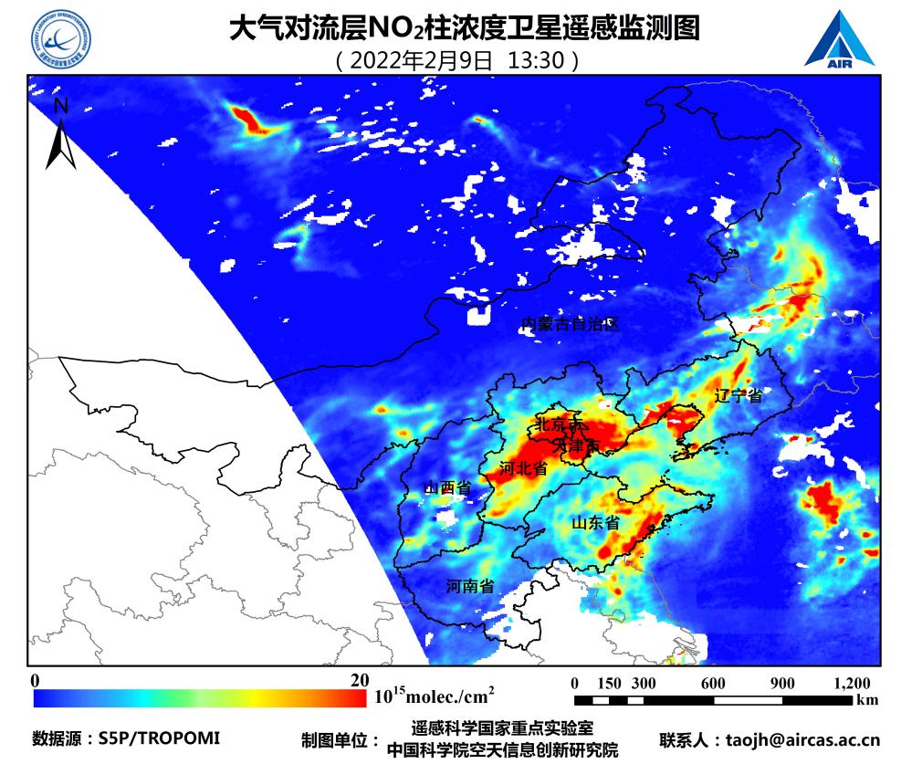 Satellite observation of nitrogen dioxide in Beijing-Tianjin-Hebei and surrounding areas. (Sentinel-5P on Feb. 9, 2022) (Image by AIR)