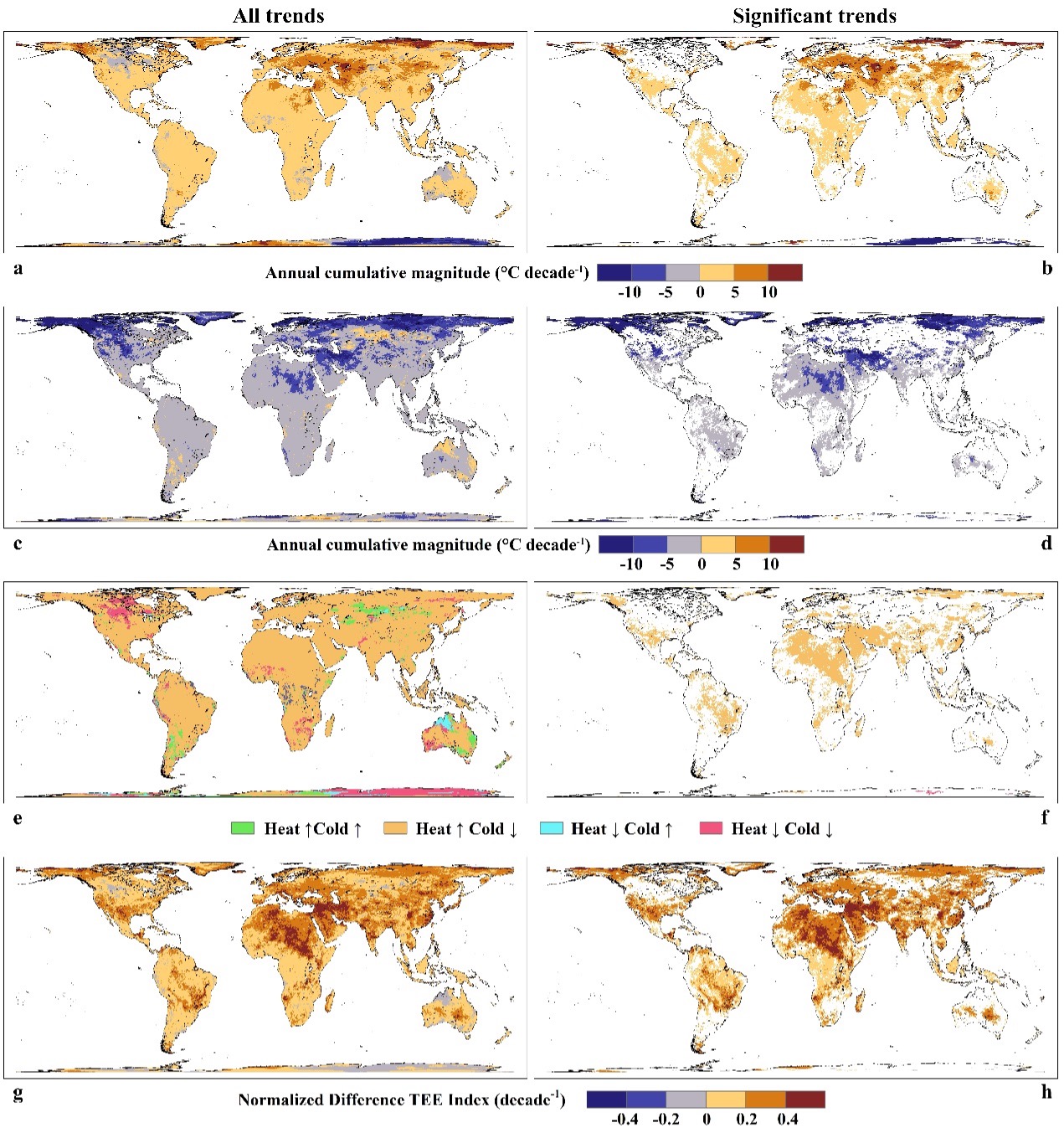 Global distribution of temporal trends for heat and cold extremes. a, b Trends of annual cumulative magnitude (M) for heat extremes. c, d Trends of M for cold extremes. e, f Classes of trend combinations. g, h Trends of Normalized Difference TEE Index (NDTI). Trends were estimated for 1980-2018 using Mann-Kendall test and Theil-Sen method, and b, d, f, and h show only significant trends at the 5% level.