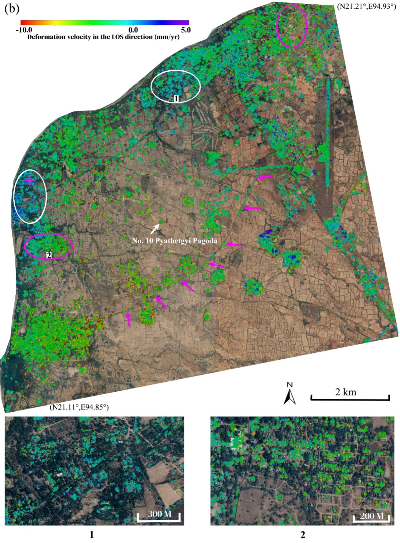 However, its age, combined with the surface subsidence and earthquakes over the region have posed great threats to the stability of the historic monuments and iconic pagodas at the vast site. Thus, the monitoring of landscape surface subsidence and vulnerability of the monuments is crucial to the protection and sustainable management of the Bagan heritage site.