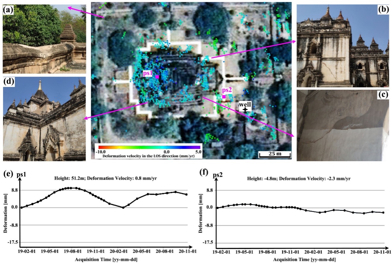 Figure 2. Structural instability observed from InSAR measurements of the Gawdawpalin Pagoda. (a) Field photographs of surface sinking, (b) and (c) cracks observed on the north-east and south-east components, and (d) stability observed on the south-west component of the temple. (e) ps1 and (f) ps2 motion time series. (Image credit: AIR)