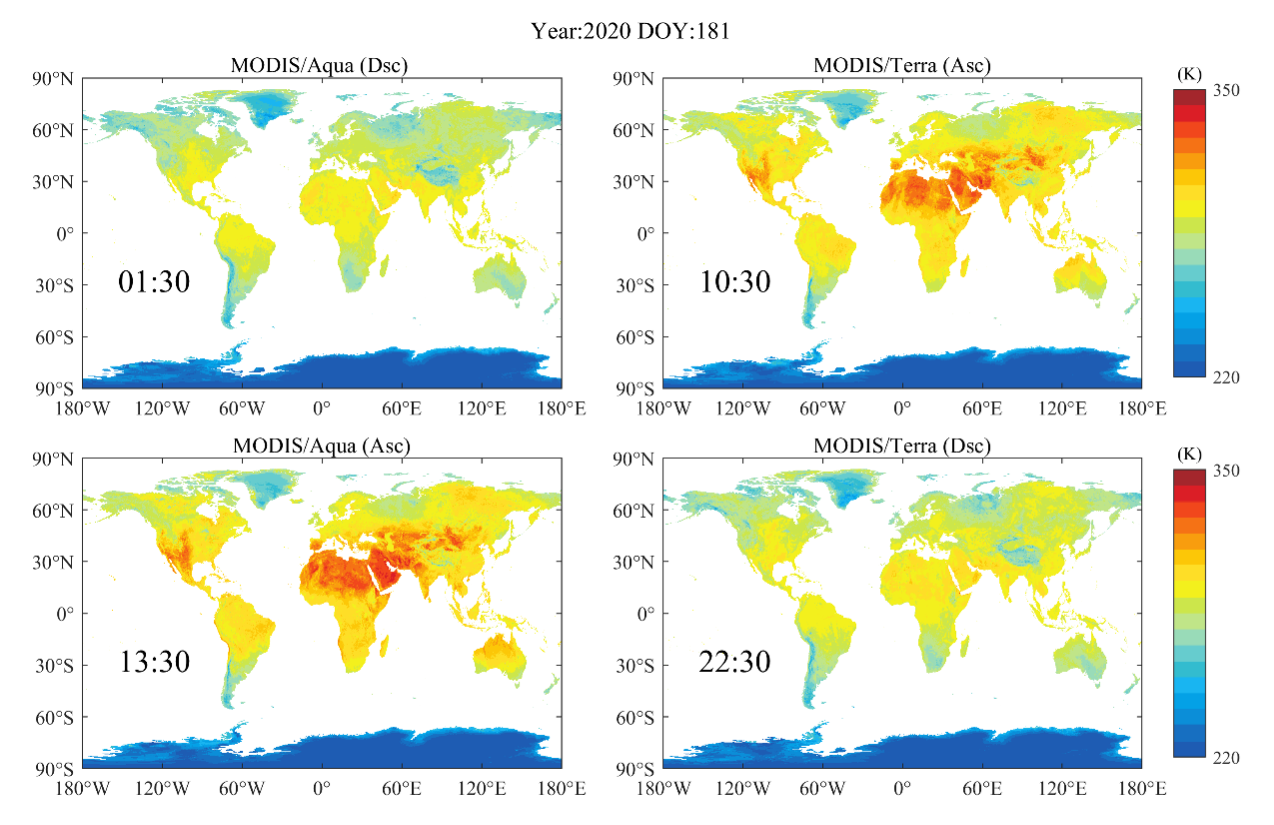 The temporal resolution of this dataset is four times a day, the spatial resolution is 0.05°, and the time span is from 2002 to 2020. Figure 1 shows the global spatial distribution of LST at different overpassing times (01:30, 10:30, 13:30 and 22:30) of this dataset.