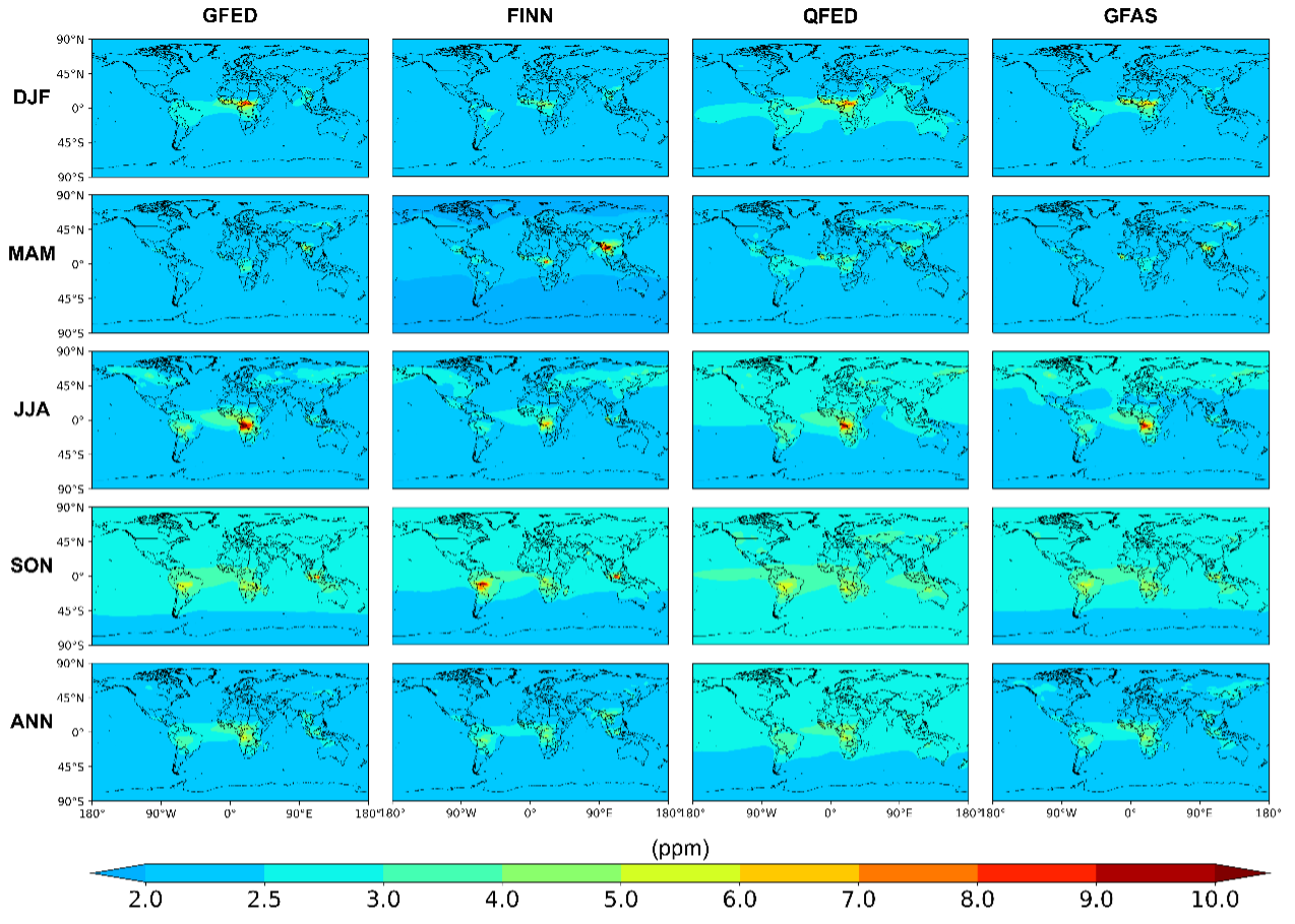 Global fires have widespread impacts on global carbon cycle and atmospheric environment with immediate direct carbon emissions. Fire carbon emission has substantial spatiotemporal variabilities and contributes significantly to the dynamics of global CO2 distributions and variances. Quantifying the impacts of fire carbon emissions on atmospheric CO2 concentrations is the basis for clarifying the carbon cycle in terrestrial ecosystems and a prerequisite for elucidating the carbon balance at global and regional scales.