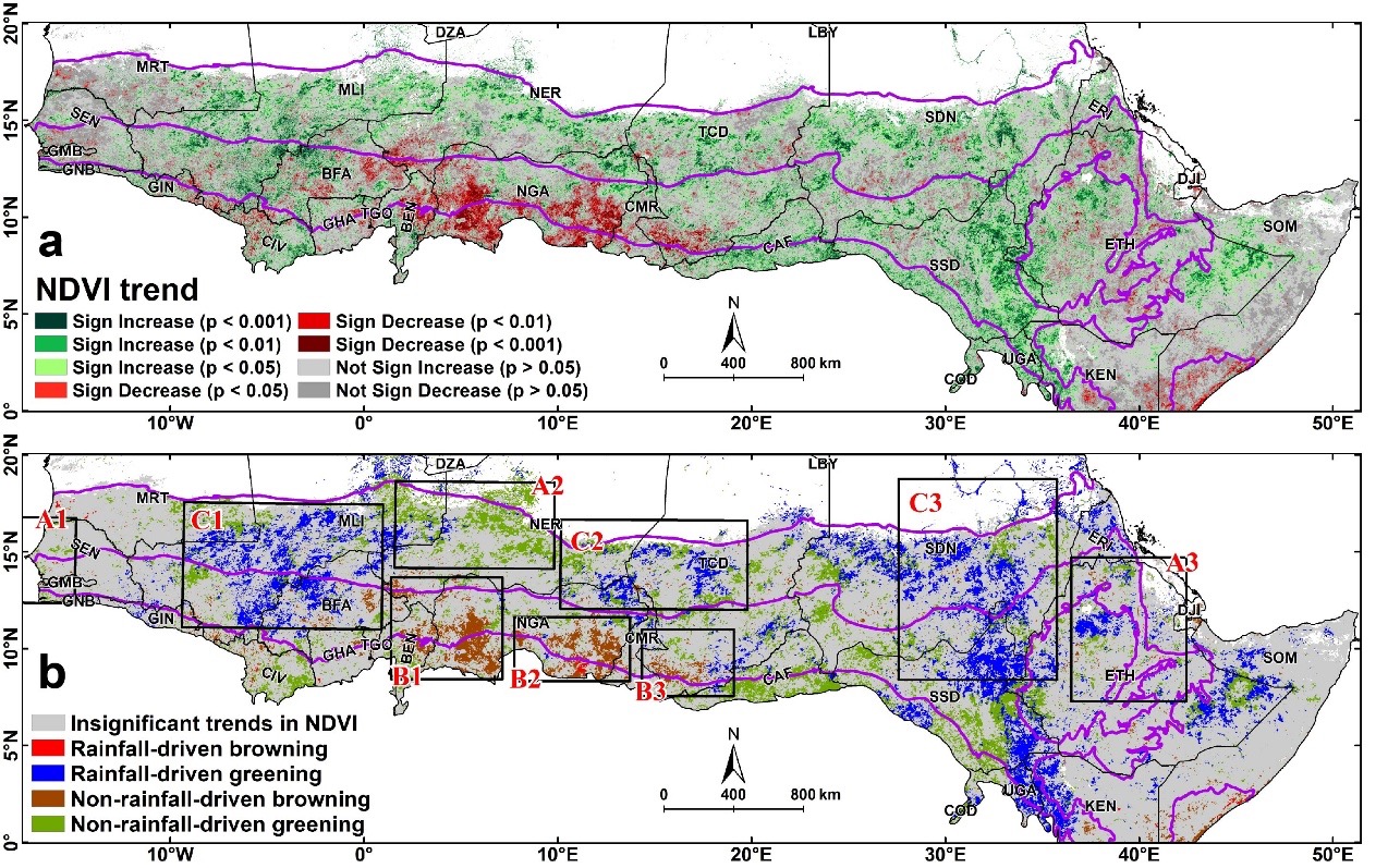 Figure 1 (a) Trends in annual mean NDVI; (b) Rainfall-driven attributions of NDVI trends. Gray areas show insignificant trends (p≥0.05). The black boxes in (b) are the nine hotspot sub-regions selected to analyze the impacts of potential drivers on vegetation greenness trends, including non-rainfall-driven greening clusters (A1: Senegal; A2: central Niger; A3: Ethiopia), non-rainfall-driven browning clusters (B1: Benin-Niger-Nigeria; B2: eastern Nigeria; B3: southern Chad), rainfall-driven greening clusters (C1: western Sahel (Mali and western Burkina Faso); C2: western Chad; C3: Sudanian savannah (Sudan and South Sudan)). (Image by AIR)