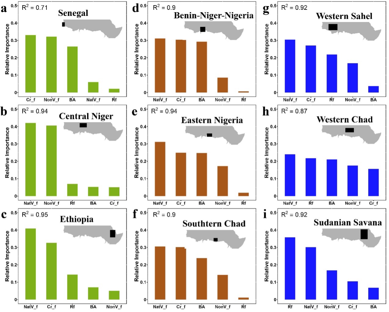 Figure 2 The relative importance of rainfall variation (Rf), change in cropland fraction (Cr_f), change in natural vegetation fraction (NatV_f), change in non-vegetation fraction (NonV_f), and change in burned area (BA) to the NDVI anomalies (Z-score of NDVI) within (a-c) non-rainfall-driven greening clusters, (d-f) non-rainfall-driven browning clusters and (g-i) rainfall-driven greening clusters in the Sudano-Sahelian region during 2001–2020. R2 in the figures is the coefficient of determination of the multiple linear regression between the Z-score of NDVI and the Z-scores of the five factors. (Image by AIR)