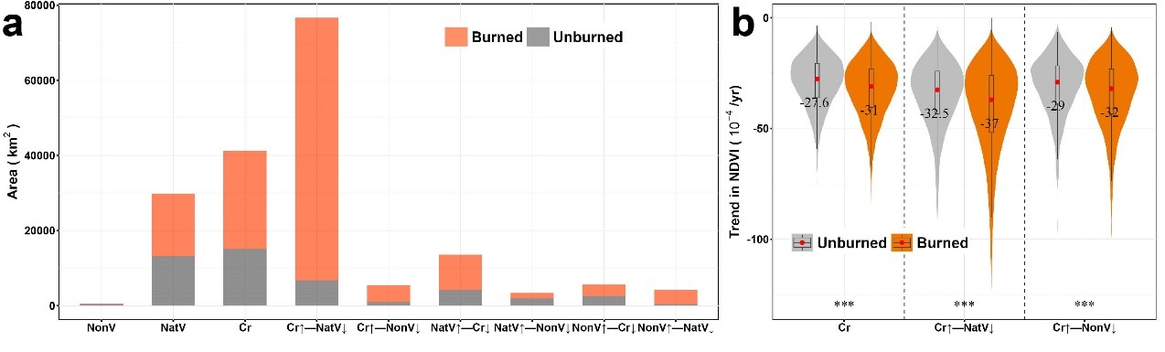 Figure 3 The combined impacts of LULC changes and repeated fires on vegetation greenness for non-rainfall-driven browning clusters in the sub-regions of central West Africa. (a) The area of unchanged/changed LULC classes with burned and unburned situations. (b) The violin diagrams of NDVI trends in agricultural areas with burned and unburned situations. The red dots and numbers in the violin diagrams represent the median values of NDVI trends. (Image by AIR)