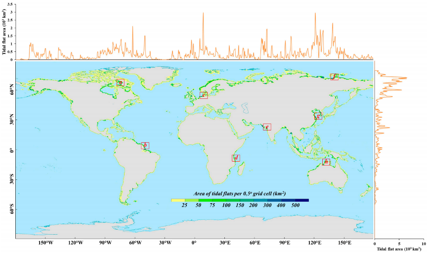 The spatial distribution of global tidal flats and their longitude and latitude statistics. (Image by AIR)