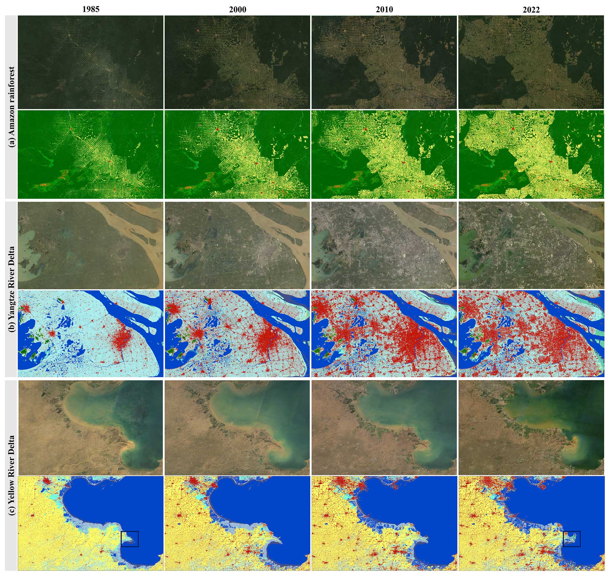 Three typical enlargements showing the land-cover changes according to GLC_FCS30D from 1985 to 2022 in (a) the Amazon rainforest, (b) the Yangtze River Delta in China, and (c) the Yellow River delta in China. (Image by AIR)
