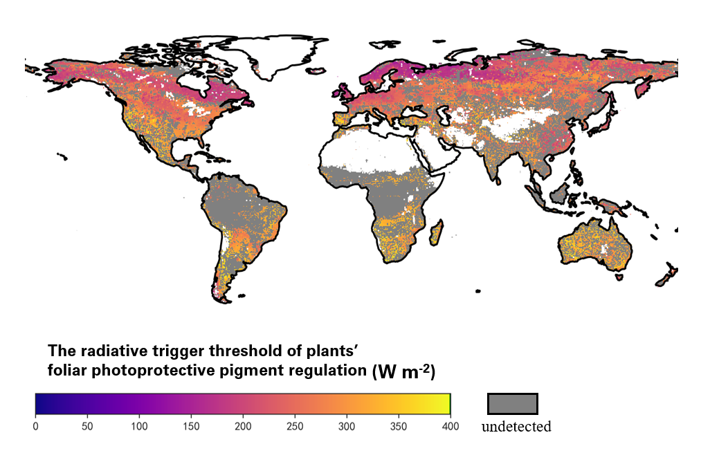 Photoprotective pigments in plant leaves protect them from damage caused by excessive sunlight. Changes in these pigments are essential for plants to survive in harsh environments and serve as indicators of environmental stress. However, understanding when and where these adjustments occur across diverse ecosystems has been challenging due to difficulties in observing them on a large scale.