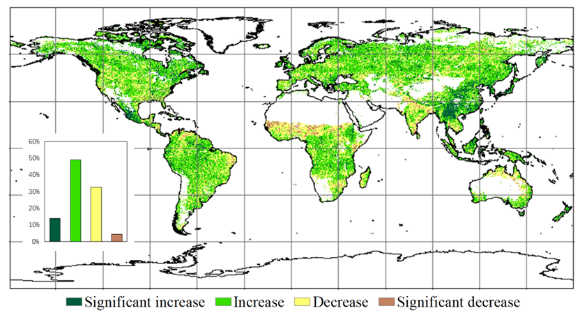 After undergoing the temporal correction, the vegetation SIF increased by 0.70?% per year from 2007 to 2021. Notable, about 62.91?% of the global vegetated regions saw an increase in SIF, suggesting an overall increase in vegetation SIF and photosynthesis during the growing season.