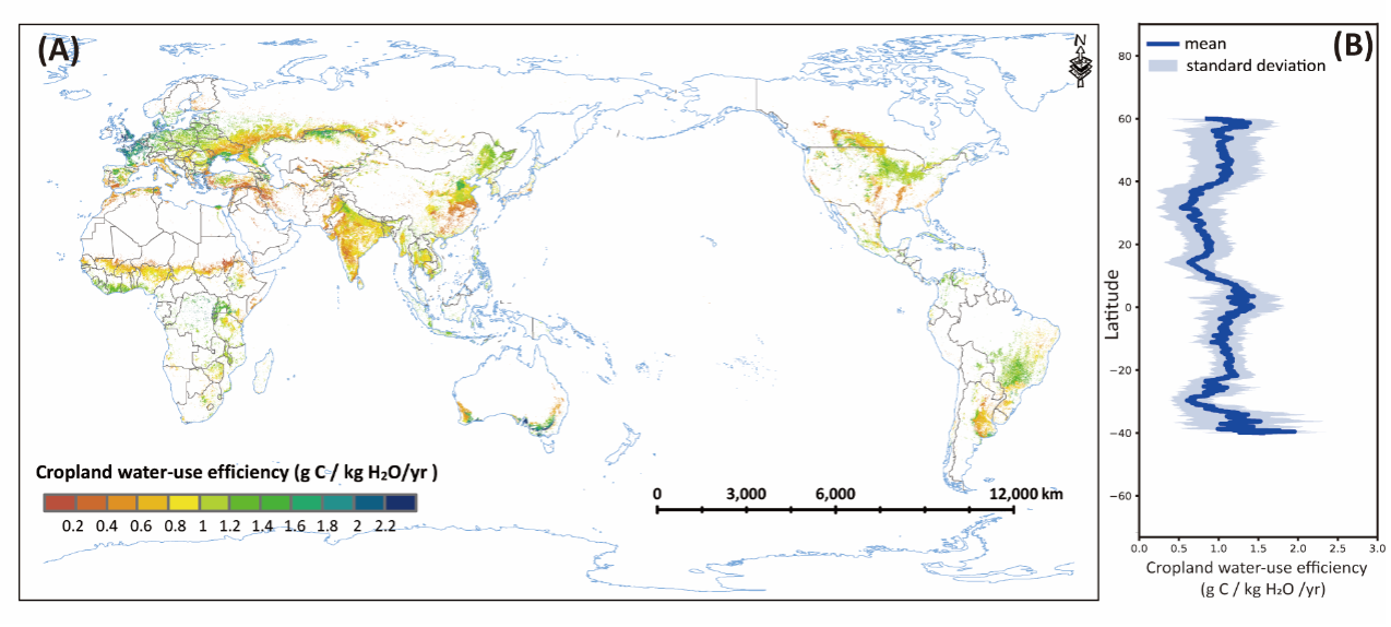 Spatial pattern (A) and latitudinal profile (B) of global mean annual cropland water-use efficiency. (Image by AIR)