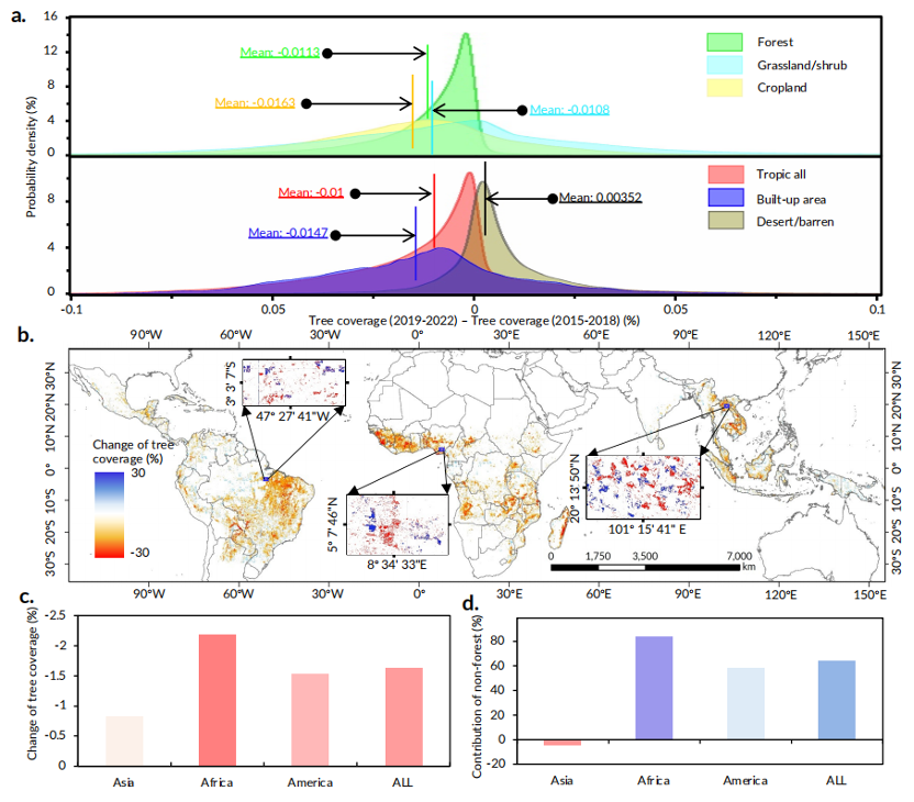 The research, led by Professor WANG Li from the State Key Laboratory of Remote Sensing and Digital Earth at the Aerospace Information Research Institute (AIR) of the Chinese Academy of Sciences, found that pan-tropical tree cover decreased by a net 61.05 Mha during the study period. Losses occurred not only in forests (63.93%) but also in non-forested areas like farmlands, grasslands, and cities (36.07%). Crucially, regions with high PUTC—where trees exist outside traditional forests—experienced the most intense changes, exposing limitations in commonly used 10-m resolution datasets like World Cover.