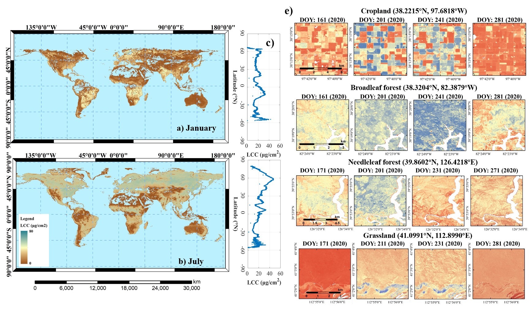 Global distribution of the MuSyQ Global LCC product. Mean LCC in January 2020 (a) and July 2020 (b). Latitudinal averages of chlorophyll (c,d). Seasonal variations at representative sites for different vegetation types in 2020 (e). (Image by AIRCAS)